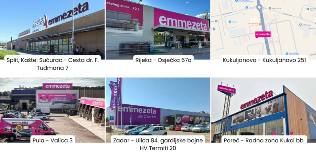 Emmezeta je trgovački lanac specijalizirane distribucije proizvoda za opremanje kuće i doma na tržištu Europe. Ona je inspiracija za svakoga, a krasi je velika i atraktivna ponuda uz iznimnu povoljnost. Osnovna odlika Emmezete je širina asortimana koji se sastoji od namještaja, dekoracije i predmeta za uređenje doma, elektronike i bijele tehnike. No, osim širokim asortimanom, Emmezeta je specifična jer kombinira moderni dizajn i kvalitetu po pristupačnim cijenama. S fokusom na tržište, Emmezeta ima čitavu kategoriju namještaja i dekora posvećenog » uređenju apartmana i kuća za odmor.